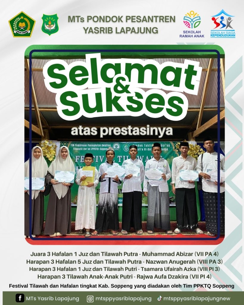 Santri MTs PP Yasrib Lapajung Tunjukkan Keunggulan Qur’ani di Festival Tilawah dan Hafalan Tingkat Kab. Soppeng Soppeng — Prestasi membanggakan kembali ditorehkan oleh santri Madrasah Tsanawiyah Pondok Pesantren Yasrib Lapajung. Sebanyak empat santri berhasil meraih juara pada Festival Tilawah dan Hafalan Al-Qur’an tingkat Kabupaten Soppeng yang diselenggarakan oleh Tim PPKTQ Kabupaten Soppeng. Dalam ajang bergengsi […]