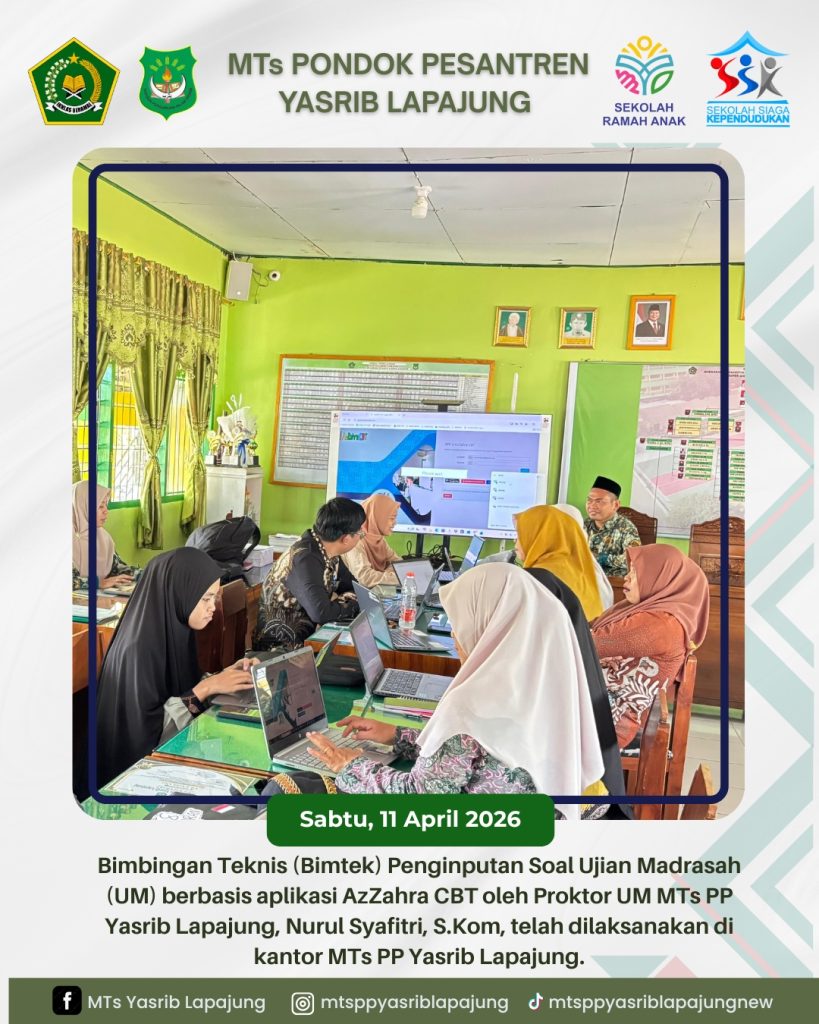 Lapajung, 11 April 2026 — Dalam rangka meningkatkan kualitas pelaksanaan Ujian Madrasah (UM), Proktor UM MTs PP Yasrib Lapajung, Nurul Syafitri, S.Kom, menyelenggarakan kegiatan Bimbingan Teknis (Bimtek) Penginputan Soal Ujian Madrasah berbasis aplikasi AzZahra CBT. Kegiatan ini berlangsung pada Sabtu (11/4/2026) di kantor MTs PP Yasrib Lapajung. Bimtek ini diikuti oleh para guru mata pelajaran […]