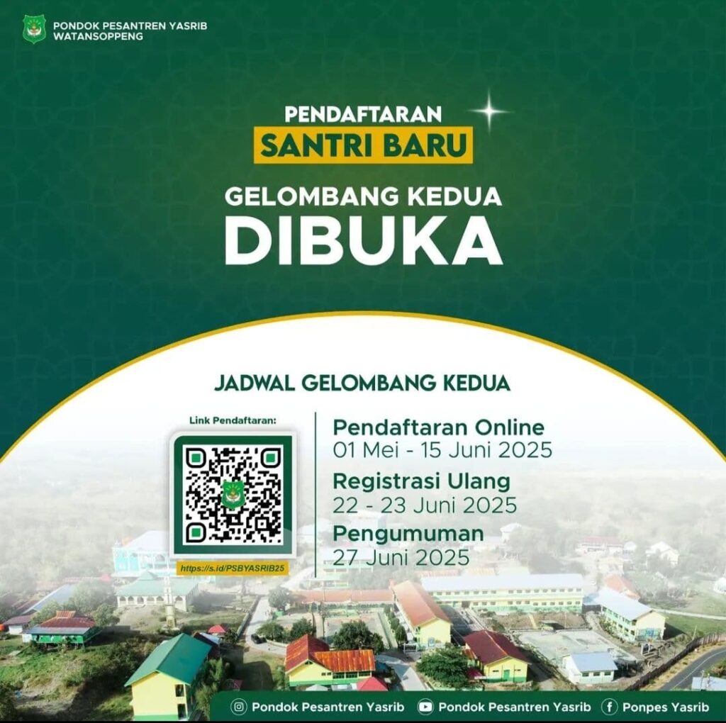 Watansoppeng – Pondok Pesantren Yasrib Watansoppeng kembali membuka kesempatan bagi calon santri untuk bergabung melalui Pendaftaran Santri Baru Gelombang Kedua. Pendaftaran online telah dibuka mulai tanggal 1 Mei hingga 15 Juni 2025. Calon santri yang telah mendaftar akan melanjutkan ke tahap Registrasi Ulang yang dijadwalkan pada 22–23 Juni 2025. Sementara itu, hasil seleksi dan pengumuman resmi santri baru akan disampaikan […]
