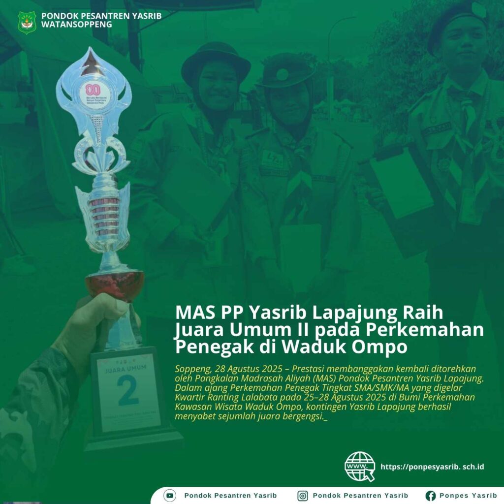 Soppeng, 28 Agustus 2025 – Prestasi membanggakan kembali ditorehkan oleh Pangkalan Madrasah Aliyah (MAS) Pondok Pesantren Yasrib Lapajung. Dalam ajang Perkemahan Penegak Tingkat SMA/SMK/MA yang digelar Kwartir Ranting Lalabata pada 25–28 Agustus 2025 di Bumi Perkemahan Kawasan Wisata Waduk Ompo, kontingen Yasrib Lapajung berhasil menyabet sejumlah juara bergengsi. Adapun raihan prestasi yang diraih antara lain: […]