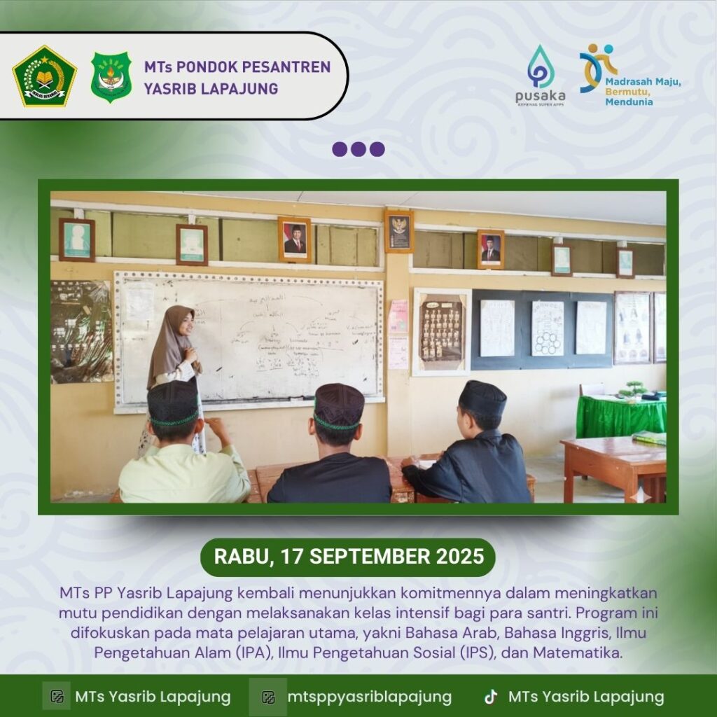 Lapajung — MTs PP Yasrib Lapajung kembali menunjukkan komitmennya dalam meningkatkan mutu pendidikan dengan melaksanakan kelas intensif bagi para santri. Program ini difokuskan pada mata pelajaran utama, yakni Bahasa Arab, Bahasa Inggris, Ilmu Pengetahuan Alam (IPA), Ilmu Pengetahuan Sosial (IPS), dan Matematika. Kegiatan tersebut berlangsung rutin pada hari Rabu, pukul 16.00–17.00 WITA, dengan melibatkan guru-guru […]