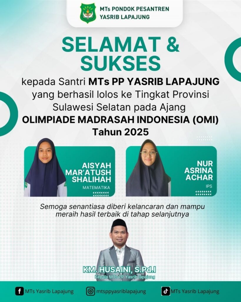 Lapajung – Prestasi membanggakan kembali ditorehkan oleh santri MTs PP Yasrib Lapajung. Dua santri terbaik berhasil lolos ke Tingkat Provinsi Sulawesi Selatan dalam ajang Olimpiade Madrasah Indonesia (OMI) Tahun 2025. Mereka adalah Aisyah Ma’atush Shalihah (bidang Matematika) dan Nur Asrina Achar (bidang Ilmu Pengetahuan Sosial/IPS). Keberhasilan ini menjadi bukti nyata dedikasi santri MTs PP Yasrib […]