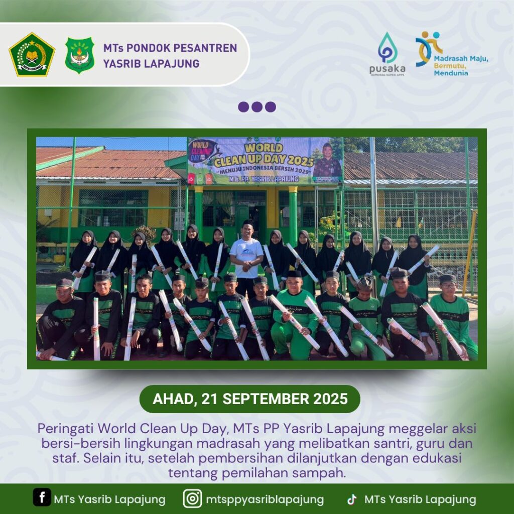 Soppeng, 21 September 2025 – Dalam rangka memperingati World Cleanup Day 2025, Madrasah Tsanawiyah Pondok Pesantren Yasrib Lapajung menggelar aksi bersih-bersih lingkungan pada hari Ahad, 21 September 2025. Kegiatan ini mengusung tema nasional “Menuju Indonesia Bersih 2029” sejalan dengan visi pemerintah untuk mencapai pengelolaan sampah terkelola 100% pada tahun 2029. Aksi yang dipimpin langsung oleh […]
