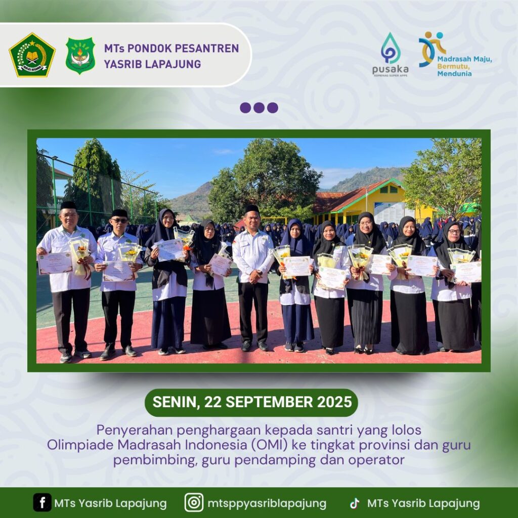 Lapajung, 22 September 2025 — Upacara bendera yang berlangsung di lapangan MTs PP Yasrib Lapajung pada Senin pagi ini terasa istimewa. Selain menjadi agenda rutin, upacara juga dirangkaikan dengan pemberian penghargaan kepada santri berprestasi serta guru pembimbing dan pendamping yang telah mengharumkan nama madrasah. Dalam kesempatan tersebut, dua santri terbaik, Aisyah Mar’atush Shalihah (bidang Matematika) […]
