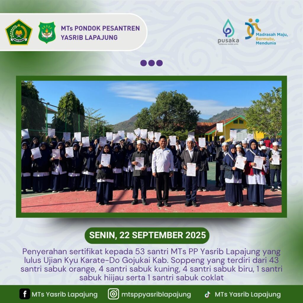 Lapajung, 22 September 2025 — Suasana Upacara Bendera pada Senin pagi di MTs PP Yasrib Lapajung terasa lebih istimewa dengan dilaksanakannya penyerahan sertifikat kepada 53 santri yang berhasil lulus Ujian Kyu Karate-Do Gojukai Kabupaten Soppeng. Dalam kesempatan tersebut, Kepala MTs PP Yasrib Lapajung menyerahkan secara langsung sertifikat kepada para santri yang telah menunjukkan disiplin, semangat, […]
