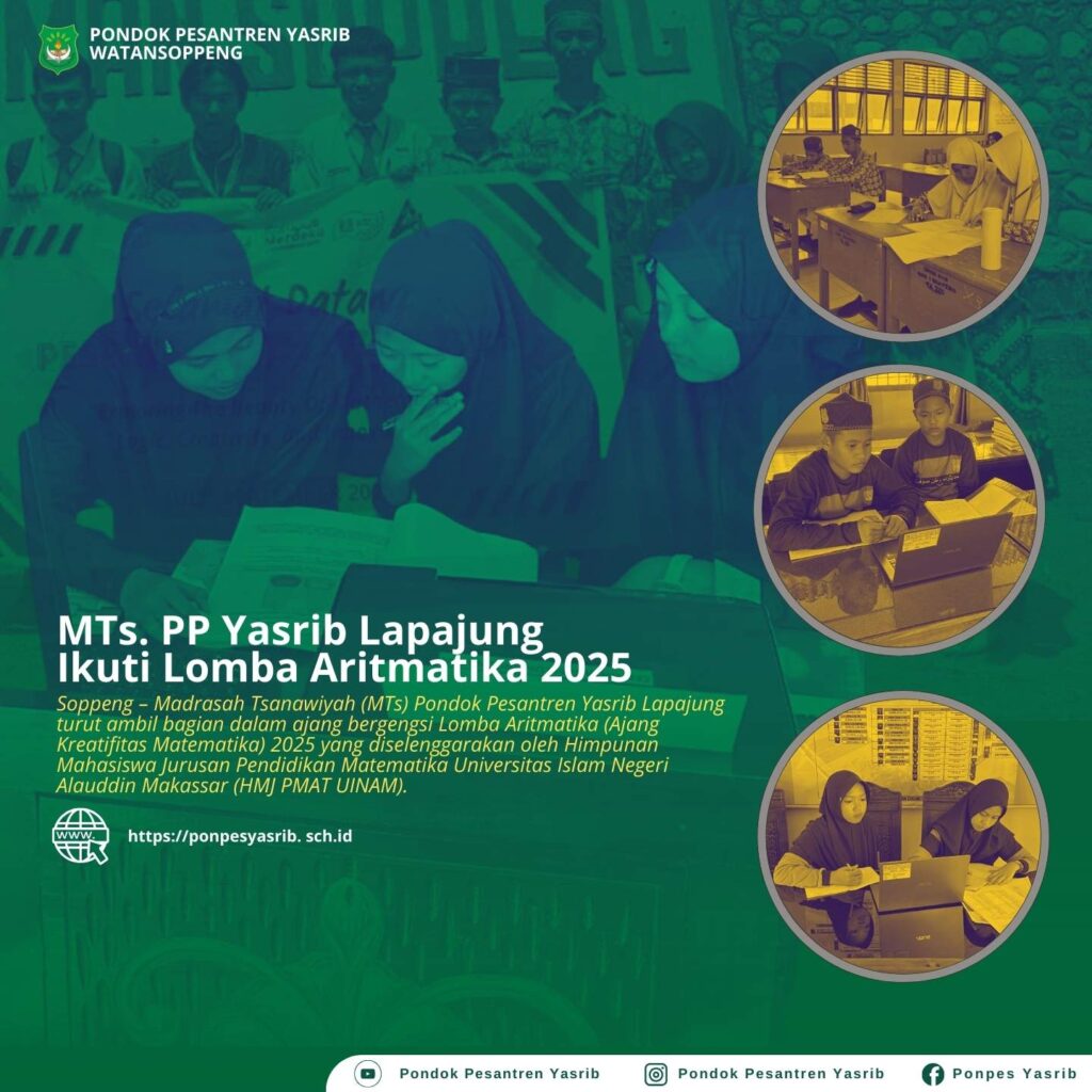 Soppeng – Madrasah Tsanawiyah (MTs) Pondok Pesantren Yasrib Lapajung turut ambil bagian dalam ajang bergengsi Lomba Aritmatika (Ajang Kreatifitas Matematika) 2025 yang diselenggarakan oleh Himpunan Mahasiswa Jurusan Pendidikan Matematika Universitas Islam Negeri Alauddin Makassar (HMJ PMAT UINAM). Dengan mengusung tema “Exploring The Beauty of Mathematics: Logic, Creativity and Innovation”, lomba ini menjadi wadah pengembangan minat […]