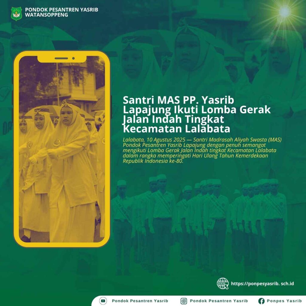Lalabata, 10 Agustus 2025 — Santri Madrasah Tsanawiyah (MTs) Pondok Pesantren Yasrib Lapajung ikut memeriahkan Lomba Gerak Jalan Indah tingkat Kecamatan Lalabata dalam rangka memperingati Hari Ulang Tahun Kemerdekaan Republik Indonesia ke-80. Acara yang dipusatkan di Anjungan I Mangkawani ini diikuti oleh berbagai sekolah dari tingkat SD/MI hingga SMA/MA yang berada di wilayah Kecamatan Lalabata. […]