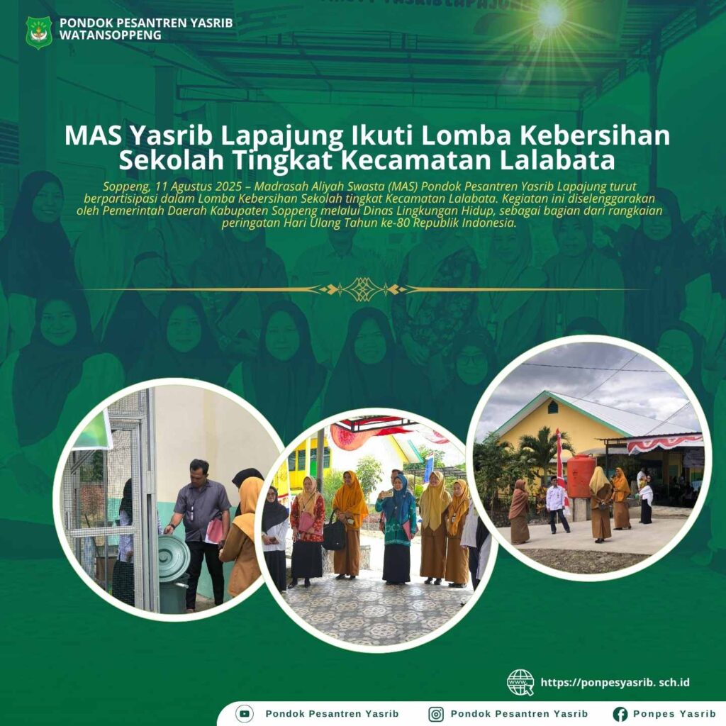 Soppeng, 11 Agustus 2025 – MTs Pondok Pesantren Yasrib Lapajung menerima kunjungan tim penilai Lomba Kebersihan Sekolah tingkat Kecamatan Lalabata. Kegiatan ini merupakan bagian dari rangkaian peringatan Hari Ulang Tahun ke-80 Republik Indonesia yang digelar oleh Pemerintah Daerah Kabupaten Soppeng melalui Dinas Lingkungan Hidup. Lomba yang diikuti oleh sekolah dari jenjang SD/MI hingga SMA/SMK/MA ini […]