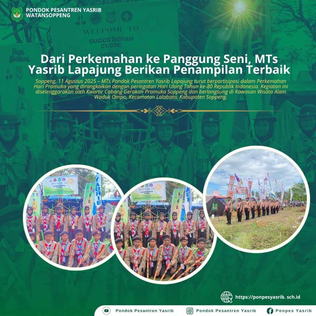 Soppeng, 11 Agustus 2025 – MTs Pondok Pesantren Yasrib Lapajung turut berpartisipasi dalam Perkemahan Hari Pramuka yang dirangkaikan dengan peringatan Hari Ulang Tahun ke-80 Republik Indonesia. Kegiatan ini diselenggarakan oleh Kwartir Cabang Gerakan Pramuka Soppeng dan berlangsung di Kawasan Wisata Alam Waduk Ompo, Kecamatan Lalabata, Kabupaten Soppeng. Pembukaan perkemahan dilaksanakan pada Senin (11/8/2025) sore, ditandai […]