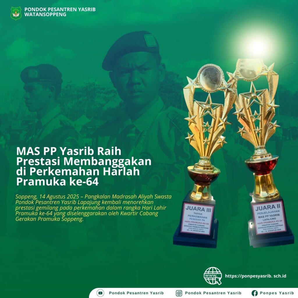 Soppeng, 14 Agustus 2025 – Pangkalan Madrasah Aliyah Swasta Pondok Pesantren Yasrib Lapajung kembali menorehkan prestasi gemilang pada perkemahan dalam rangka Hari Lahir Pramuka ke-64 yang diselenggarakan oleh Kwartir Cabang Gerakan Pramuka Soppeng. Dalam ajang bergengsi yang diikuti berbagai pangkalan se-Kabupaten Soppeng ini, kontingen MAS PP Yasrib berhasil membawa pulang Juara 2 Penjelajahan Tim Putra […]