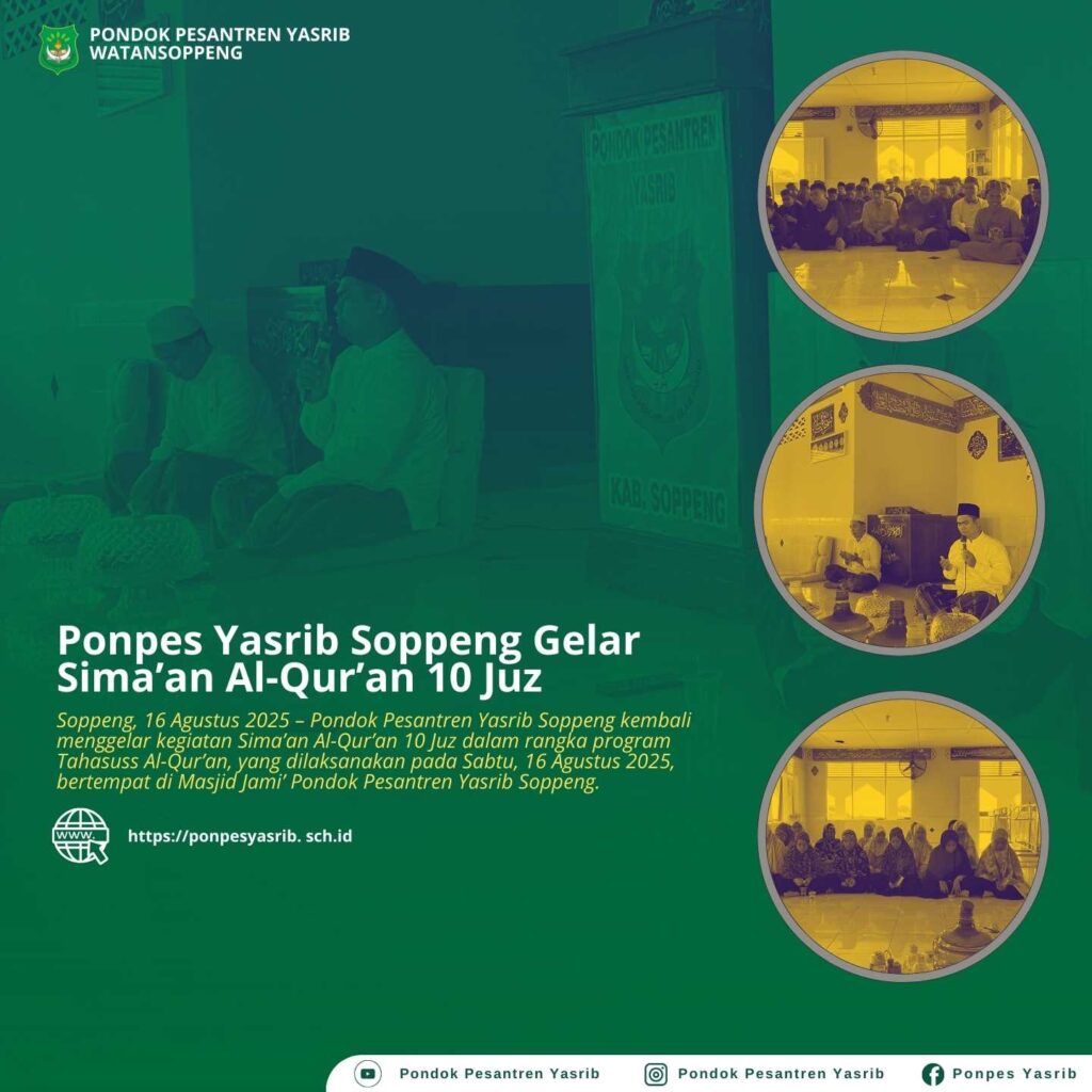 Soppeng, 16 Agustus 2025 – Pondok Pesantren Yasrib Soppeng kembali menggelar kegiatan Sima’an Al-Qur’an 10 Juz dalam rangka program Tahasuss Al-Qur’an, yang dilaksanakan pada Sabtu, 16 Agustus 2025, bertempat di Masjid Al-Munawwarah Pondok Pesantren Yasrib Soppeng. Kegiatan sima’an ini dipimpin langsung oleh Pimpinan Pondok Pesantren, KH. Taslim Basri, Lc., dan diikuti oleh para santri tahasuss […]