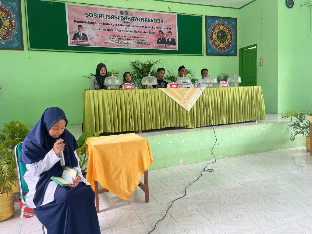 Lapajung, 11 November 2025 – MTs PP Yasrib Lapajung menjalin kerja sama strategis dengan Badan Narkotika Nasional (BNN) Kabupaten Bone melalui penandatanganan Nota Kesepahaman/Memorandum of Understanding (MoU) tentang Gerakan Aksi Madrasah Bersih dan Bebas dari Penyalahgunaan Narkoba, Psikotropika, dan Zat Adiktif Lainnya.